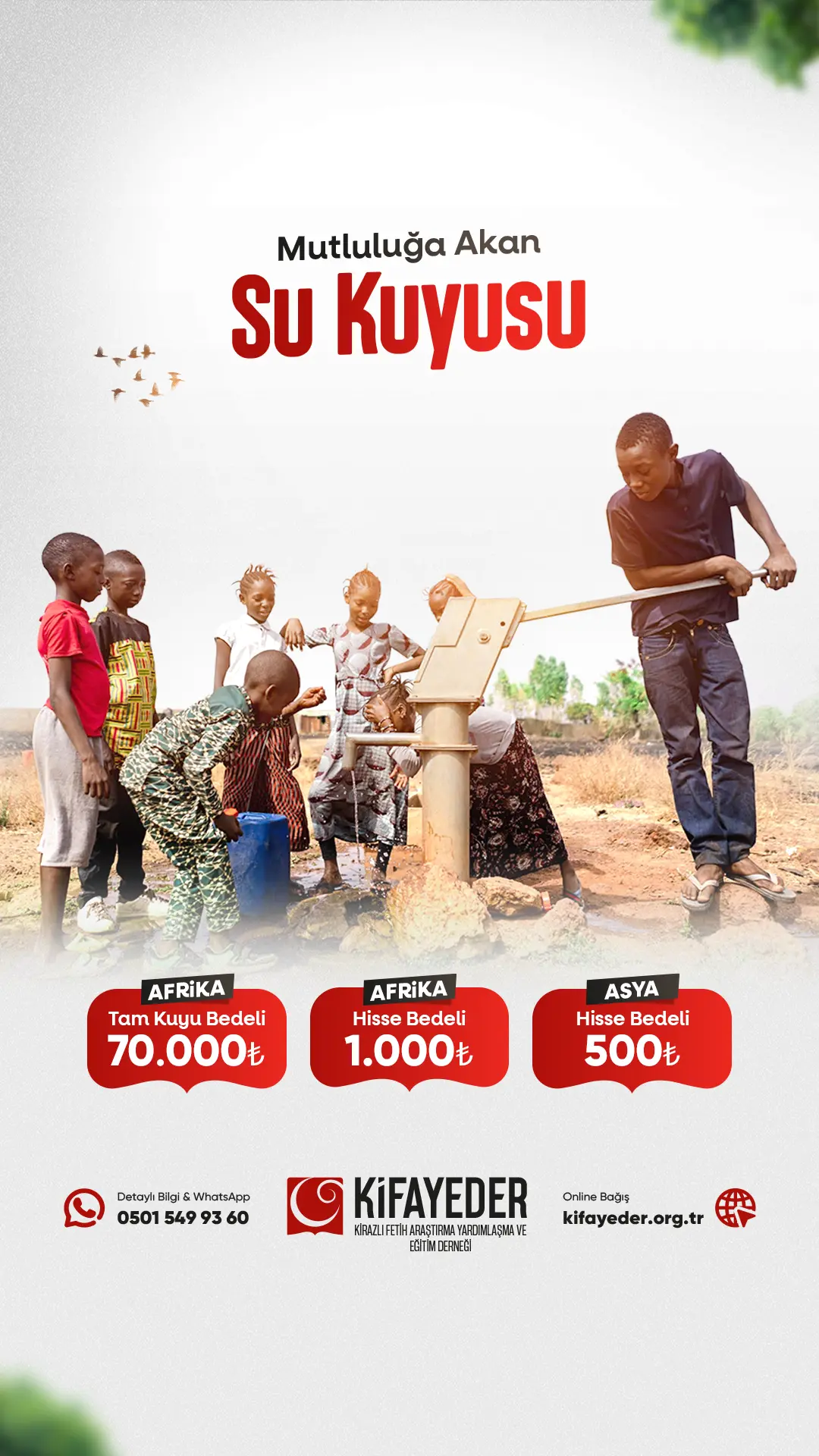 Bizler yaşadığımız coğrafyada yer altı ve yer üstü su kaynaklarına kolayca ulaşabiliyor, temiz suyu çoğu zaman farkına bile varmadan tüketebiliyoruz. Ancak dünyanın birçok bölgesinde insanlar, temiz suya ulaşabilmek için her gün kilometrelerce yol kat etmek zorunda kalıyor. Kifayeder, Afrika ve Asya’nın suya erişimin son derece sınırlı olduğu bölgelerinde hayırseverlerin destekleriyle kalıcı su kuyuları açarak, kuraklık ve yoksullukla mücadele eden topluluklara umut olmaktadır. Açılan her bir su kuyusu; yalnızca temiz içme suyuna erişim sağlamıyor, aynı zamanda hastalıkların azalmasına, eğitim hayatının desteklenmesine ve günlük yaşamın kolaylaşmasına katkı sunuyor. Siz de bir 500 Tl’den başlayan bir hisse bağışı ile bu hayra ortak olabilirisiniz.